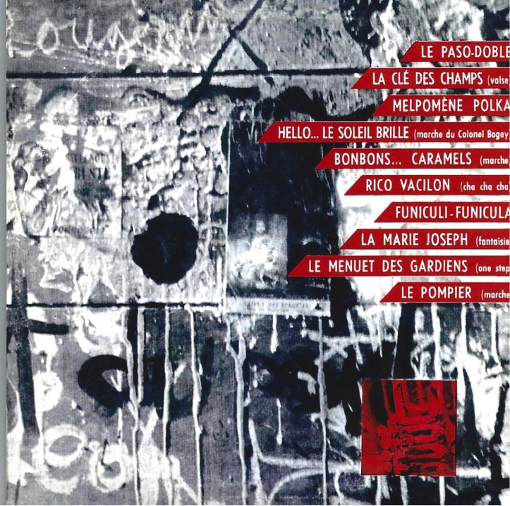 Dix pistes sur ce 25cm.....Nous avons varié les registres, et chaque pupitre a un rôle parfaitement défini. "Le Pont de la Rivière Kwaî" a été largement amputé au montage, ce que je ne peux que regretter, car au deuxième chorus, on entendait parfaitement le contrechant à deux voix (trombone + bugle) derrière la mélodie; "La Marie-Josèphe" est tout à fait remarquable, et le duo Champris (trombone) - Marin (cri de la mouette) y est irrésistible. La fin de la face B est très réussie, notamment "Le Menuet des Gardiens" où les bruiteurs se déchainent de façon remarquablement synchroniées ("service une fois, deux fois, etc.") en reproduisant fidèlement l'atmosphère de l'atelier en fin de charette. Aguéra conclut en affirmant que "n'empêche, La Fourrière, notre célèbre gardien-chef, ira à l'Institut 26 !" ; "Le Pompier", hymne des Beaux-Arts, sonne bien, mais la tonalité choisie, en Mi bémol(5), si elle est plus facile pour les instrumentistes, ne favorise hélas pas les chanteurs... »