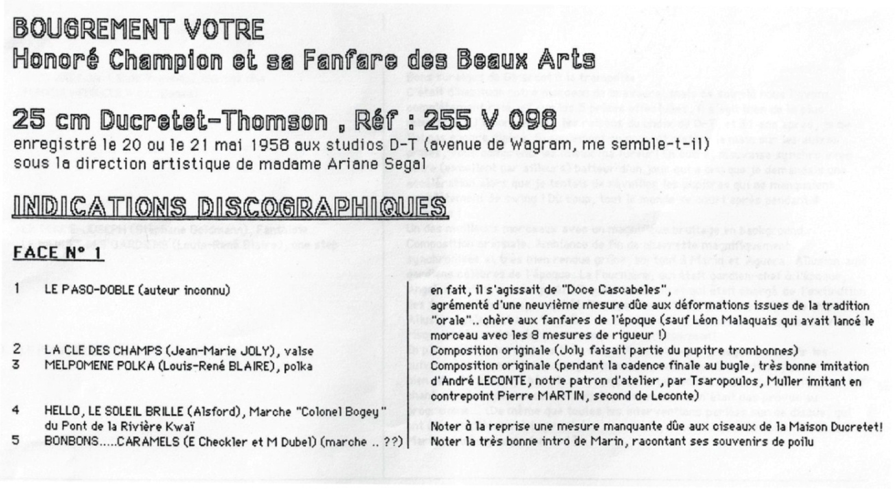 « ...Honoré Champion : Un coup d’essai qui aurait pu être un coup de maître. Honoré Champion, compositeur érudit et analyste notoire, mérite une attention spéciale : il possède un rythme redoutable entraînant pêle-mêle les fausses notes et les autres. D’excellentes choses, telles «La Clef des Champs», petite valse champêtre de bonne facture, «Melpomène polka» en passe de devenir un classique de l’Ecole, «La Marie-Joseph», aimable fantaisie, et le «Menuet des Gardiens», intelligent pastiche de one step. D’autres moins bonnes, comme «Hello, le Soleil brille», pâle reflet du «Pont de la rivière Kwaï», ou «Rico Vacilon» déjà entendu. De l’ambiance, trop peut-être (une ambiance de studio quelque fois pénible). Un bon disque en résumé : «Bougrement Vôtre» 255 V 098.- Ducretet-Thomson. »Lorsque j'avais commencé ma première discographie, en 1989, Louis-René Blaire m'avait adressé ces deux fiches de commentaires techniques à propos du disque de sa fanfare :
