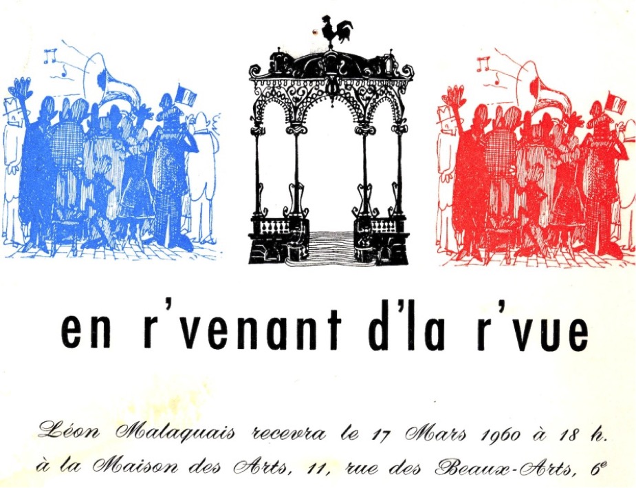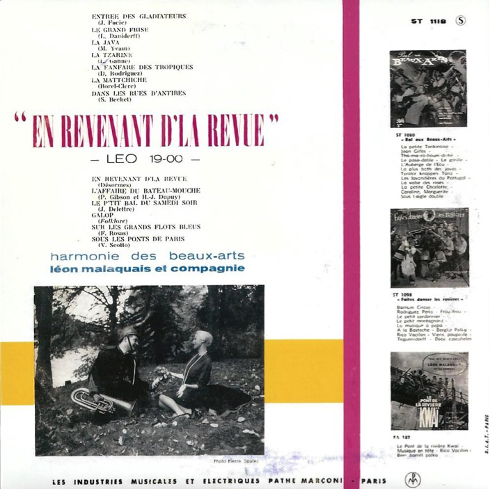 « Nous entrons dans le studio (situé dans la rue Jenner, dans le XIIIè, loué par Pathé à Jean-Pierre Melville) et j'aperçois un magnifique piano Steinway ; je tape quelques accords dessus, puis, sans savoir pourquoi, enchaîne sur l'Entrée des Gladiateurs que personne ou presque ne connaît à l'époque ; les copains sortent alors leurs instruments et viennent autour du piano faire une cacophonie complètement surréaliste qui ressemble de très loin au thème mais qui a le mérite de détendre l'atmosphère ! On n'aura pas besoin de litrons de gros rouge aujourd'hui pour être en forme. Et cela plait tellement aux ingénieurs du son qu'ils décident, avec la complicité de Michel Day, d'en enregistrer une prise. C'est sur cette introduction complètement loufoque que débutera le disque En revenant de la revue.Le disque sort donc officiellement le 17 mars 1960 sous le label PATHE ST 1118 , c’est un microsillon de 25cm, 33 tours et porte le titre de « EN REVENANT DE LA REVUE ».