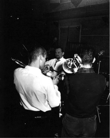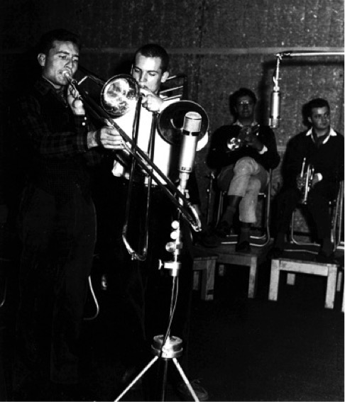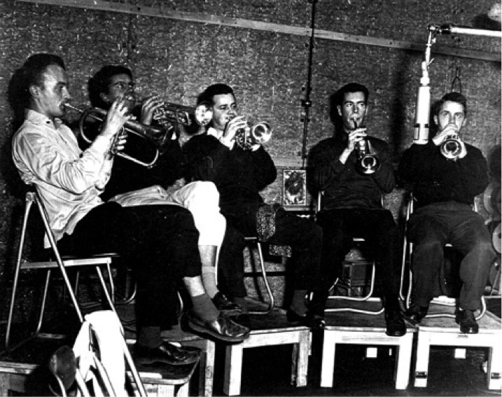 La troisième séance, également fin 1960 dût attendre pour se faire que Trifloquet soit libéré de ses obligations militaires (il rentra, je crois, en septembre 60). Lui et moi, (j’avais entre temps abandonné le bugle pour le cornet, et amélioré mon « tagada ») eûmes pour mission de rajouter en playback quelques accents, attaques ou « tagadas » sur certains morceaux comme Funiculi. Le mixage fait ressortir ces interventions un peu trop nettement. On y remarque la remontée de Trifloquet dans Funiculi « ré-mi-fa-sol-la-si », superbement piquée, juste avant le refrain. Pas commode toutefois de jouer avec le casque sur les oreilles : on a vraiment l’impression de jouer sous l’eau !