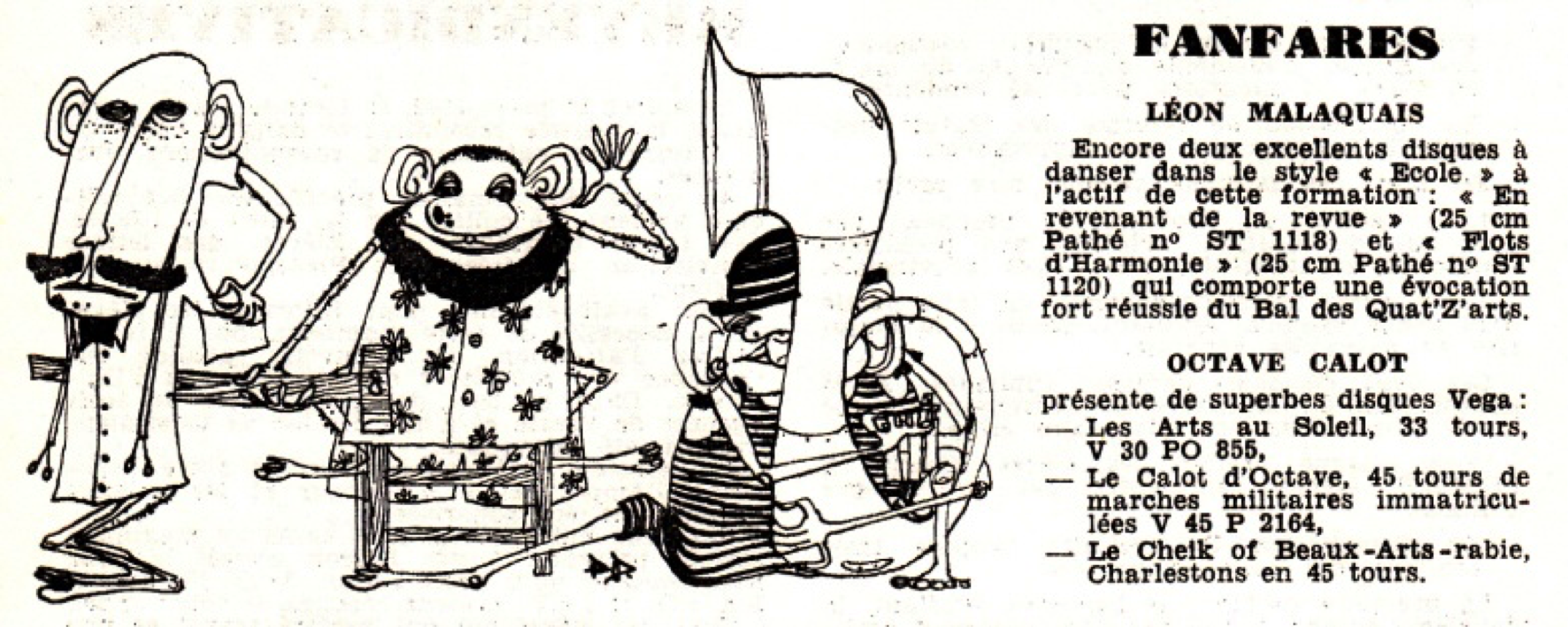 Une autre séance eut lieu après la rentrée d’octobre 1960, où nous avions touché une cargaison de nouvôs de grande qualité et qui ferait plus tard les beaux jours de l’Olympia : Moufle, Herten, Wasser et Ivorra chez Leconte, Rémy, Pollak, Dalix, Tissier chez Baudouin. Ceux-ci, sous la direction de Sicardon et du Gros, furent chargés de créer l’ambiance autour des airs typiquement 4 Z’Arts du second disque. Vint s’y ajouter Fernier dont on reconnaît particulièrement la voix dans le Pompier. Également notre célèbre Denise dont on entend quelques interventions. Cet apport se révéla excellent. Grâce à cela, ce disque devient un document très intéressant à l’ambiance survoltée, sur la face 4 Z’Arts.