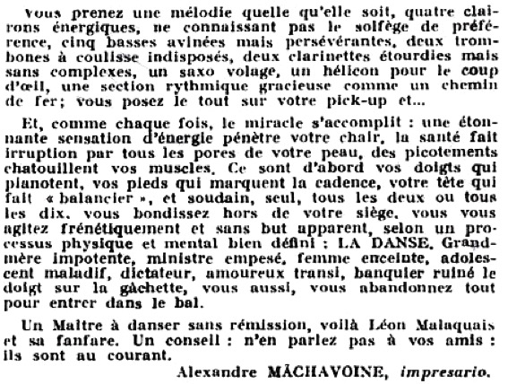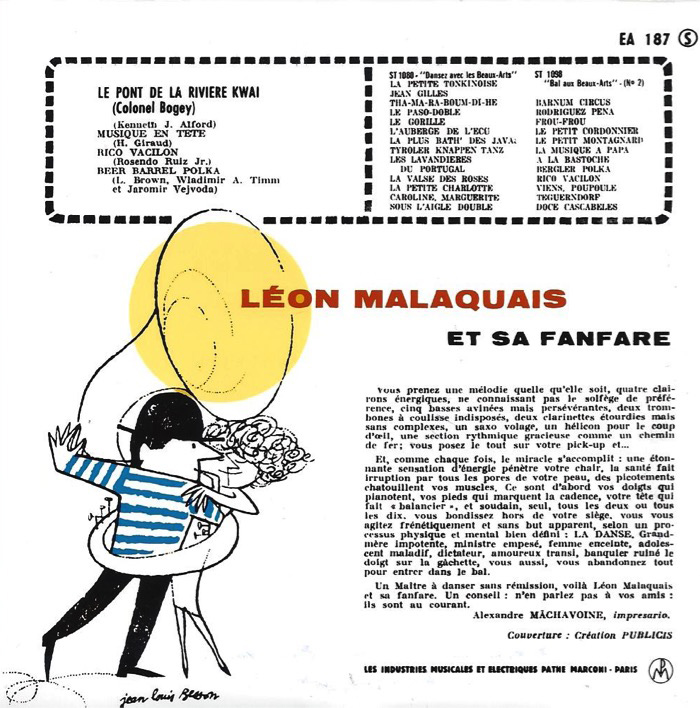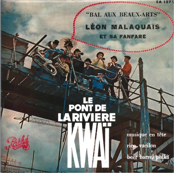Après «Bal aux Beaux-Arts», Léon vient d’enregistrer un Super 45 tours Pathé. Si « Beer Barrel Polka » (pourquoi des trompes d’autos ?) est médiocre et le «Pont de la rivière KwaÏ» sans intérêt, l’amusant «Rico Vacilon» plein de trouvailles et surtout le ronflant «Musique en tête» suffisent à faire acheter le disque : «Le pont de la rivière Kwaï» - disque Pathé EA 187. »
