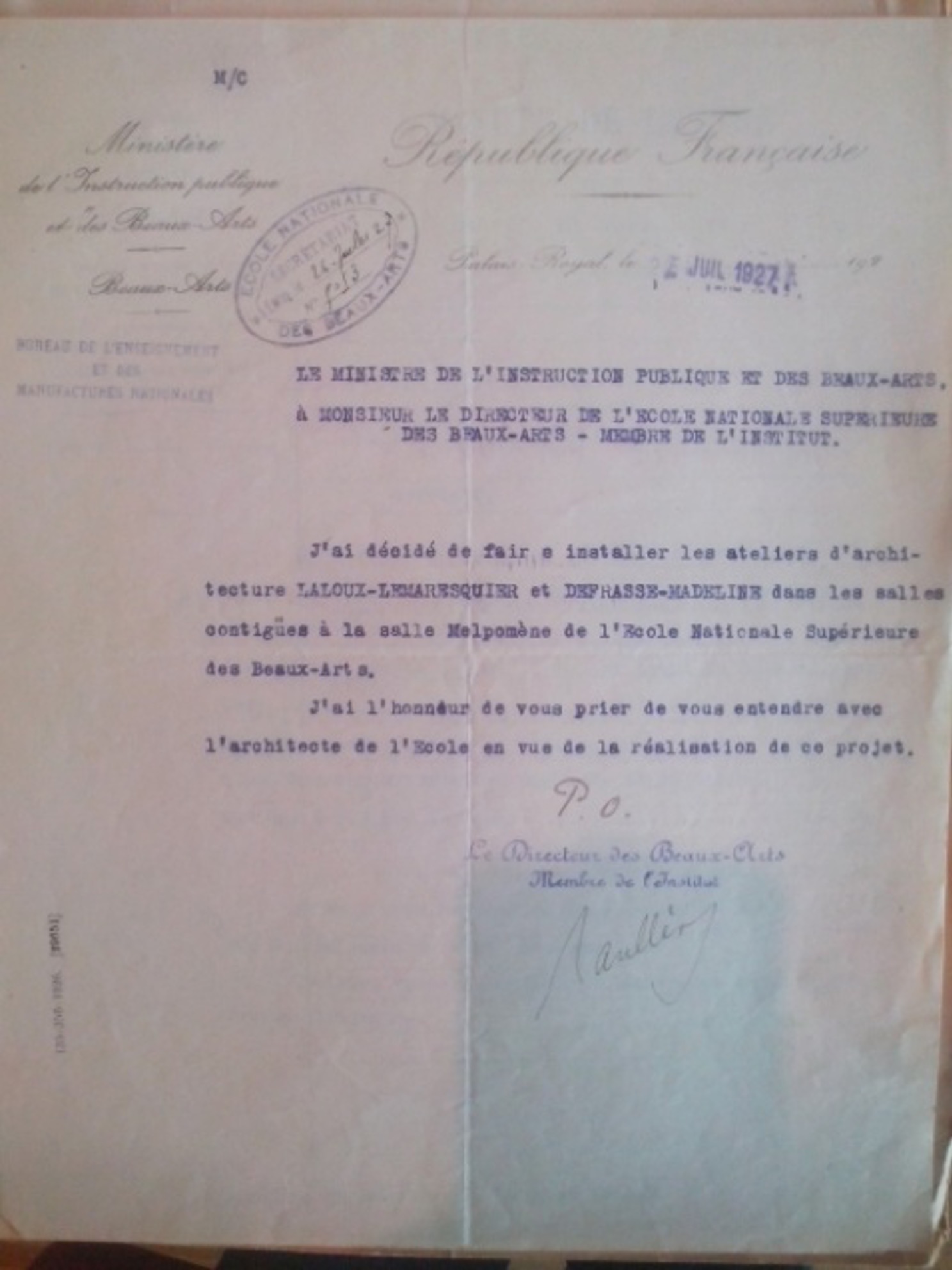 Lettre du Ministre des Beaux-Arts donnant instruction au directeur de l'École des Beaux-Arts d'installer les ateliers Laloux-Lemaresquier et Defrasse-Madeline dans une salle contigüe à la Melpo. Juillet 1927.