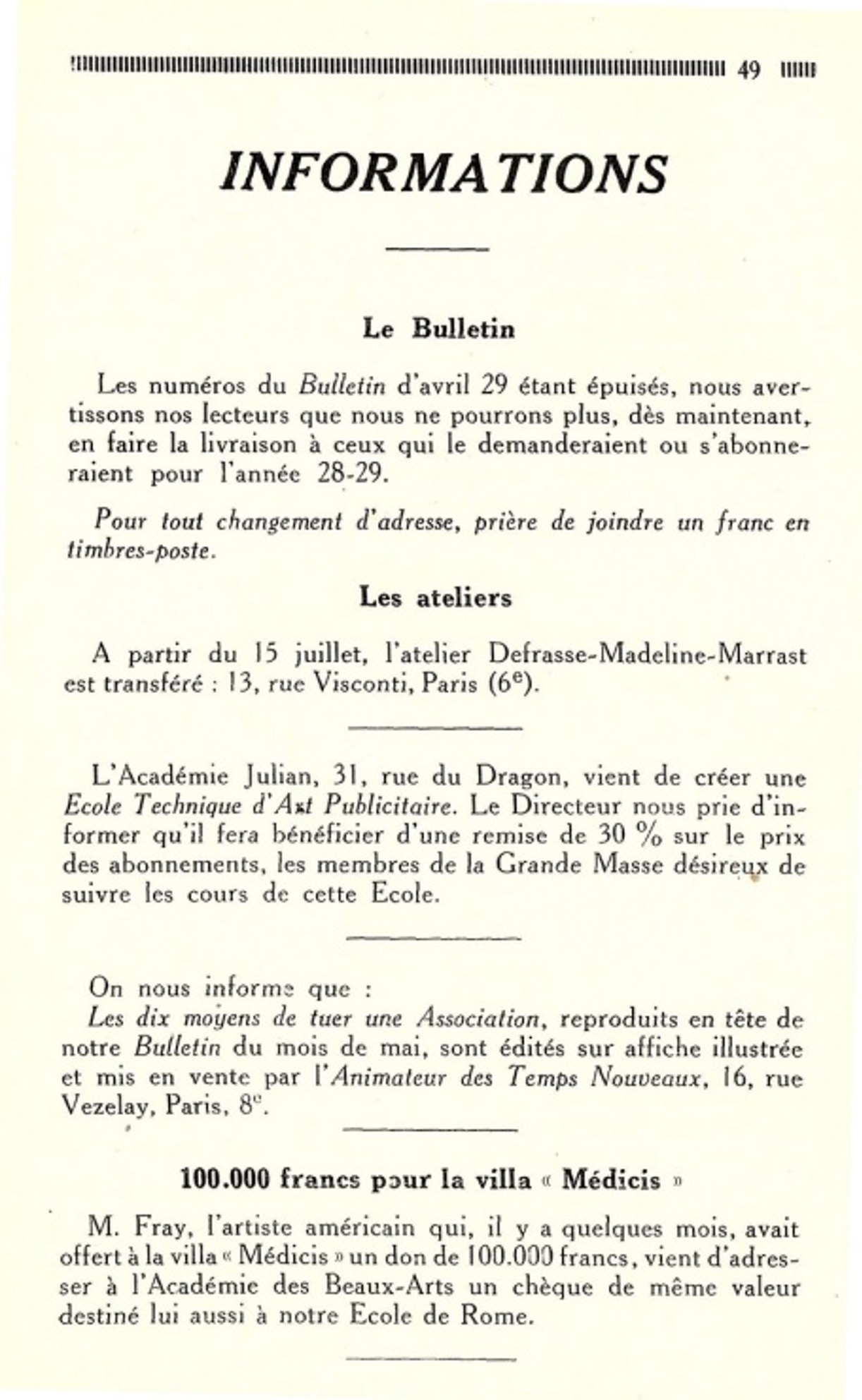 Il semble qu'il y ait une erreur sur cette pochette : la date de 1931 comme étant celle d'arrivée de l'atelier Defrasse rue Visconti. D'après le bulletin de la Grande Masse du mois de juillet 1929 (8), l'atelier Defrasse a déménagé officiellement depuis le 26 rue de Lille au 13 rue Visconti le 15 juillet 1929.
