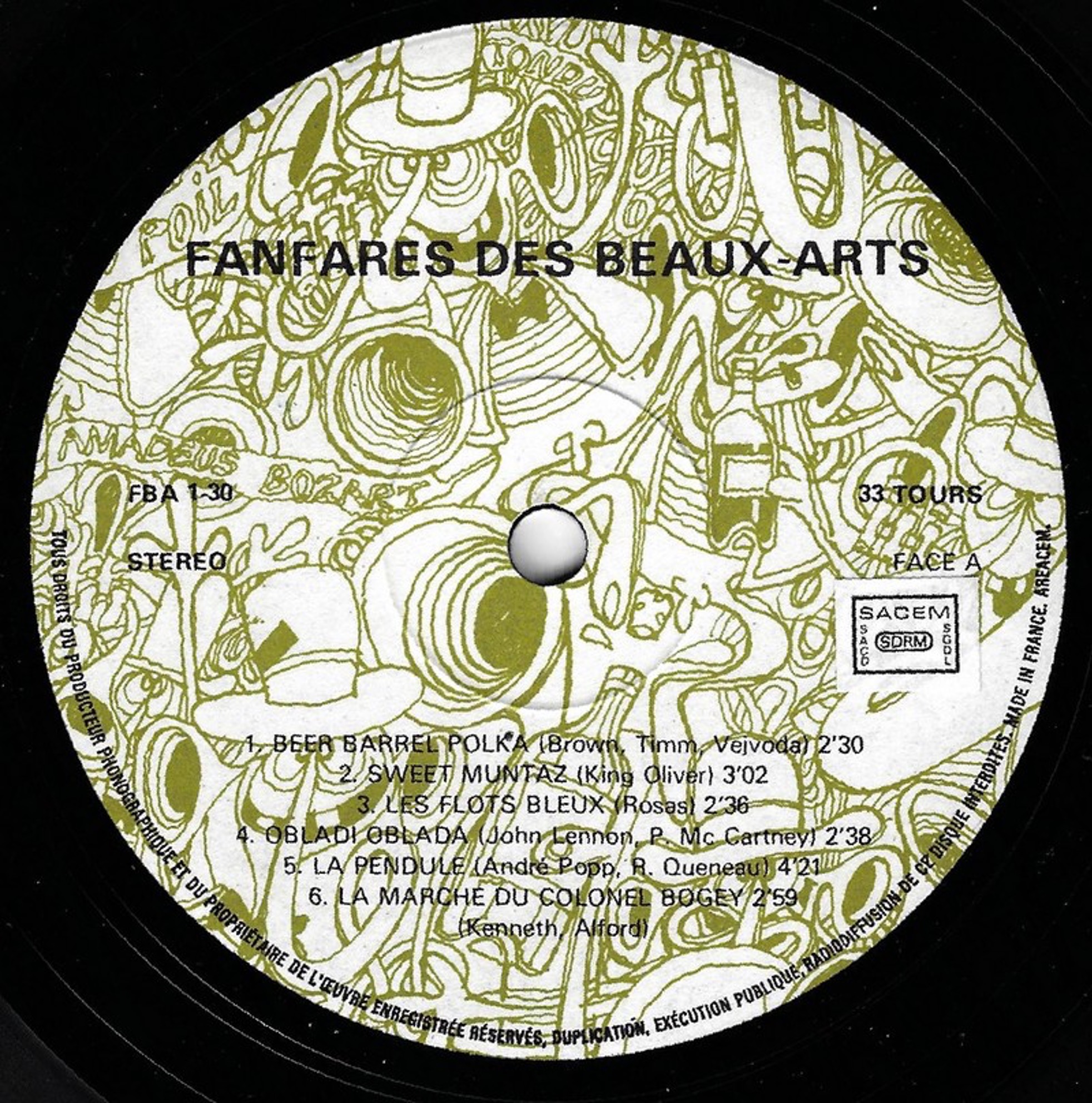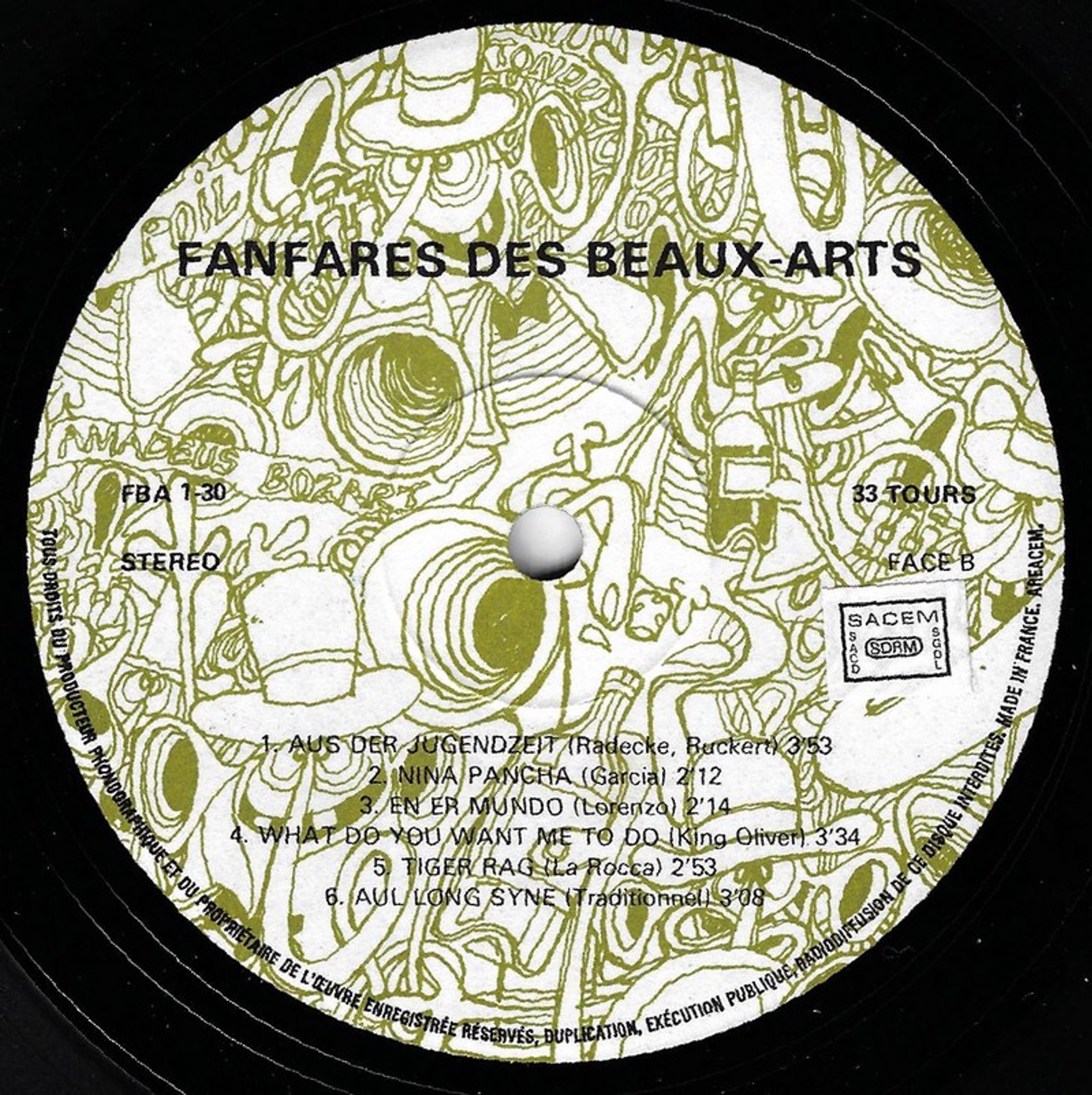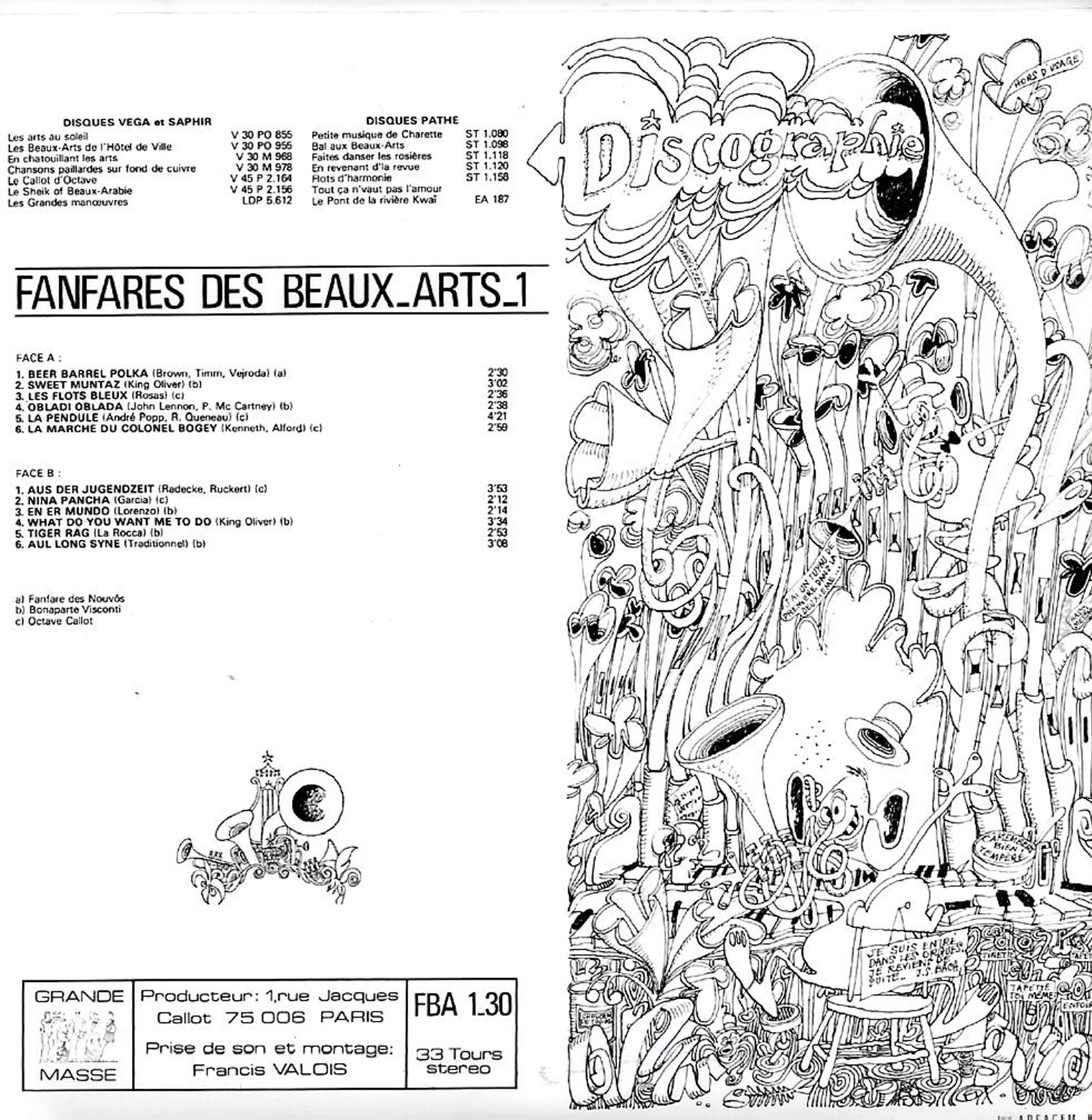 Le disque sort donc en 1973, édité par la Grande Masse sous la référence FBA 1.30, c’est un microsillon de 30 cm, 33 tours et porte le titre de « Fanfares des Beaux-Arts».