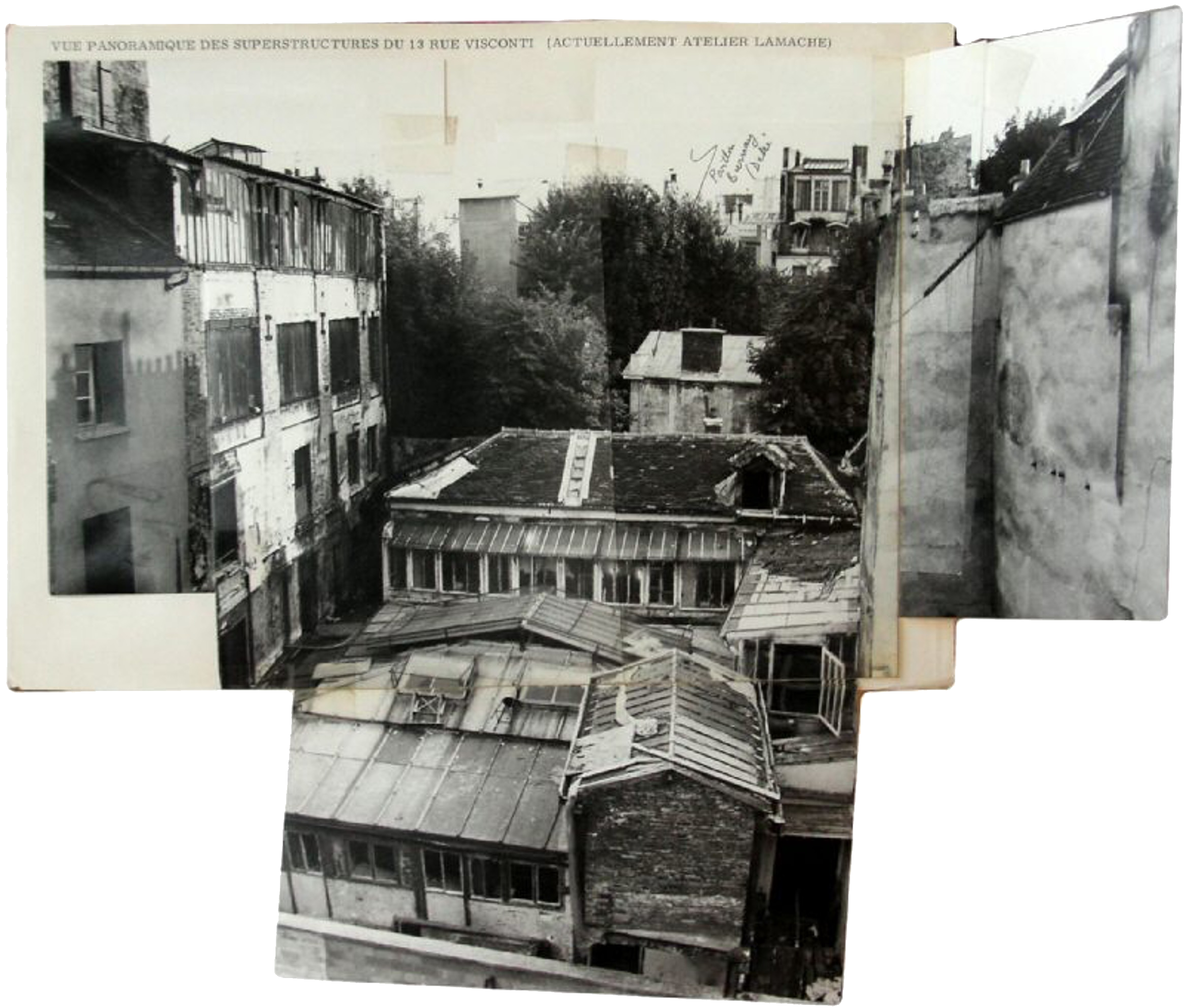 Ce volet de la pochette représente la coupe de l'atelier rue Visconti. On entrait par le 15, la double porte en bois du 13, un des rares éléments ayant été conservé actuellement étant condamnée. Puis de la cour, on rejoignait l'atelier par la porte après les escaliers illustrés ici à droite.