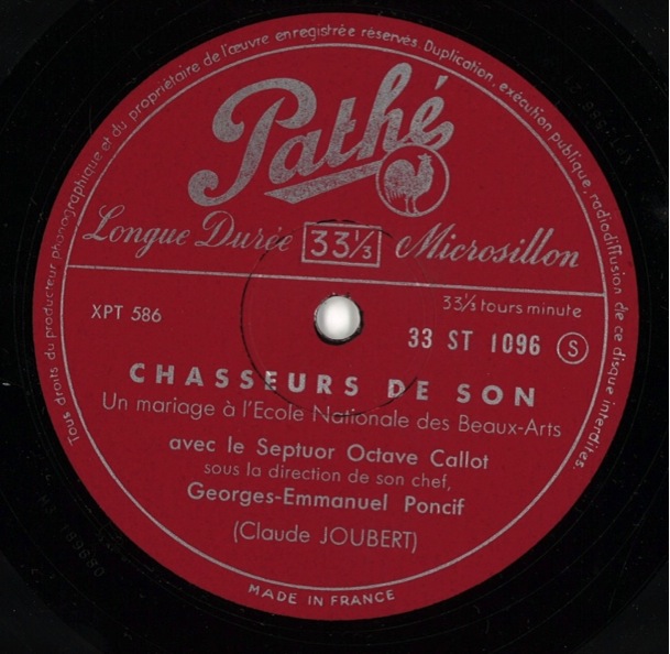 Le disque sort donc en 1957 sous le label PATHE-MARCONI ST 1096, c’est un microsillon de 25cm, 33 tours et porte le titre de « Chasseurs de son ». C'est le seul disque de Pathé-Marconi où apparait La Fanfare Octave Callot, Pathé-Marconi, étant, comme on le sait la maison de disque de la Fanfare Malaquais.