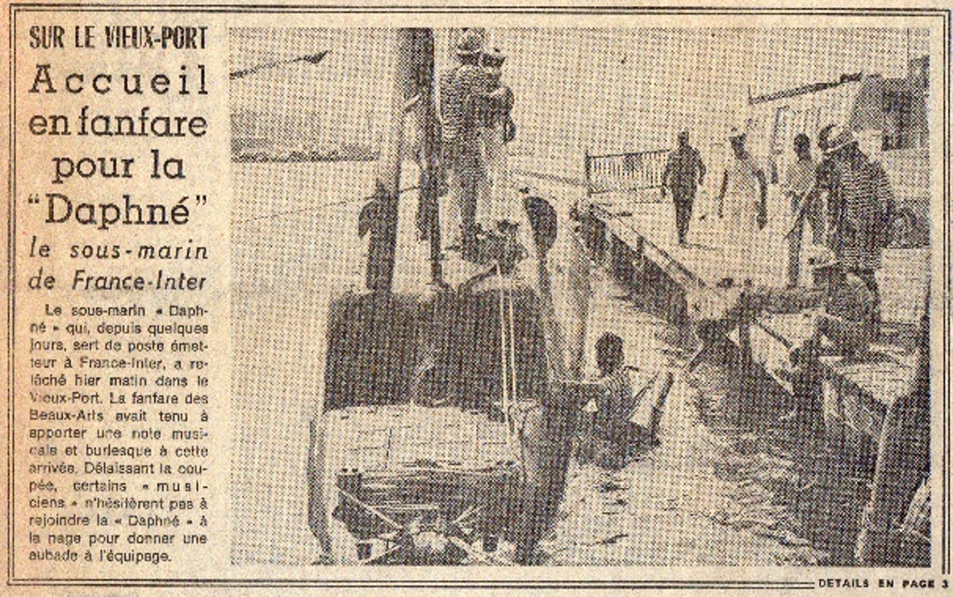 Le sous-marin Daphné avec l’équipe de France Inter était amarré au quai, nous sommes invités pour jouer à bord, Napo glisse et se retrouve dans l’eau accroché au sous-marin, la contrebasse en bandoulière. Le lendemain nous faisons la une du journal…