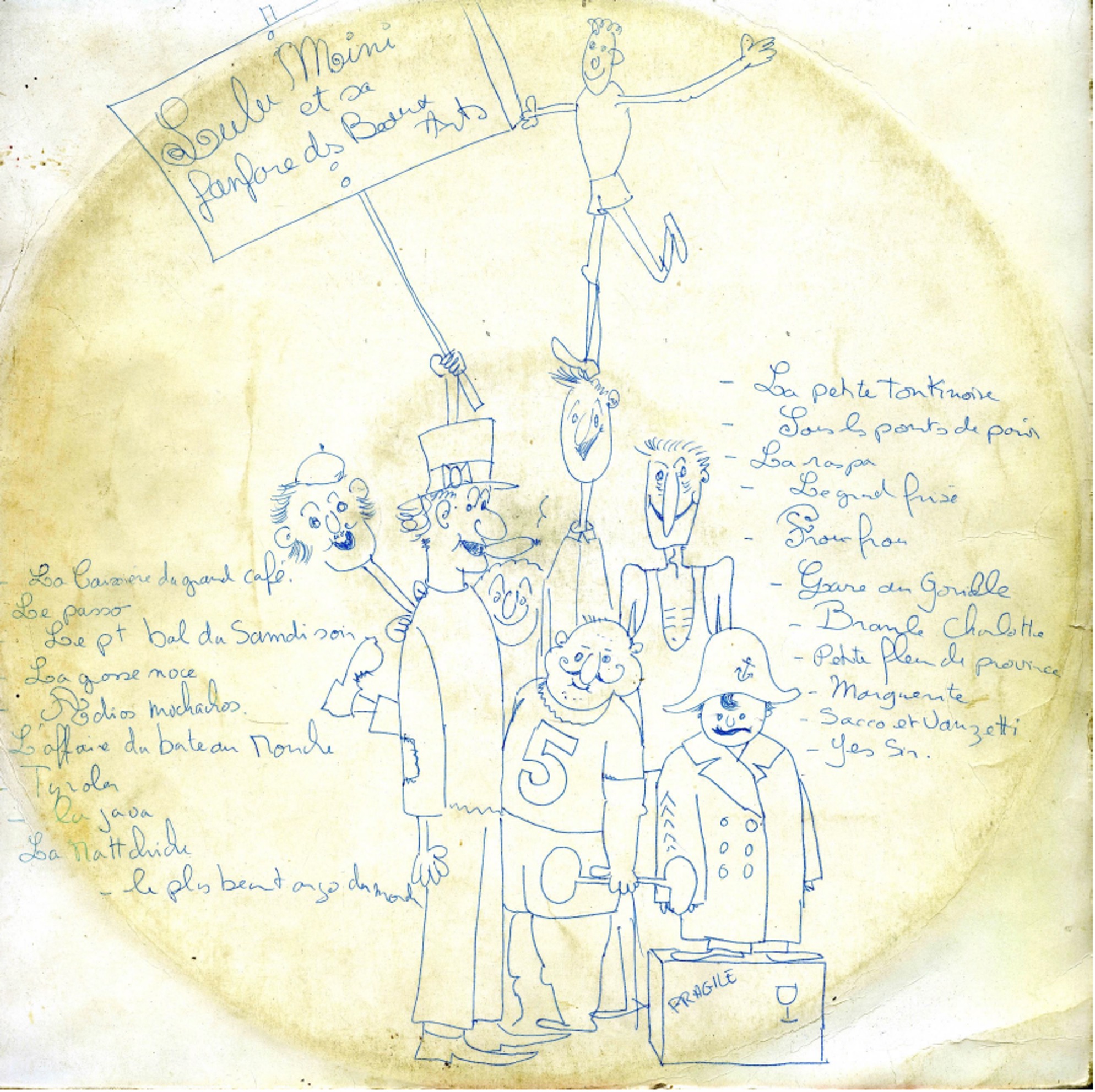 "En effet, nous avions dans l’idée de faire éditer un disque à partir de notre enregistrement. Napo contacta une entreprise qui grava deux exemplaires pour bon à tirer, avec des pochettes vierges en attendant la maquette définitive et la commande des 500 exemplaires. La Fanfare n’ayant pas les fonds, le projet n’est pas allé plus loin. Napo fit la pochette d’un des deux exemplaires avec une photo et des dessins au verso, ce disque fut offert à Albert en souvenir de notre tournée, Napo garda le deuxième exemplaire sur lequel il fit un vague croquis. " (L'Œuf)
