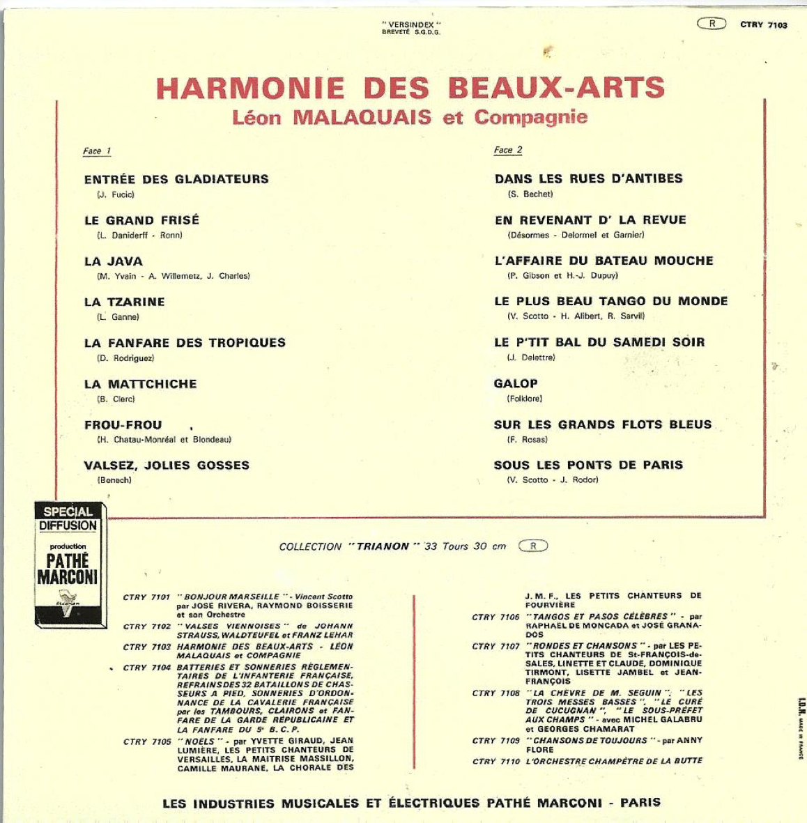 Autre sujet, on ne parle pas de Fanfare des Beaux-Arts mais d'Harmonie des Beaux-Arts. Ceci est évidemment inapproprié. Rappelons qu'une harmonie est un orchestre composé de l'ensemble des instruments à vent, ce qui laisse supposer la présence, outre les hautbois et bassons, de moult clarinettes et saxophones, toute une série d'instruments fragiles et bruyants fort loin de la noblesse des cuivres à embouchure. Admis de manière vraiment exceptionnelle, ces instruments ont été proscrits de la Fanfare... Certes, cette terminologie apparait déjà au verso du disque "En revenant de la revue" mais gageons qu'il s'agissait d'un accident, une faute de jeunesse.