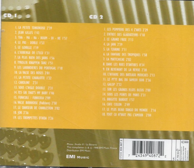 Les autres morceaux sont interprétés par Jean Laporte et son Orchestre du Cirque Mediano et par le Washington Marching Band.
