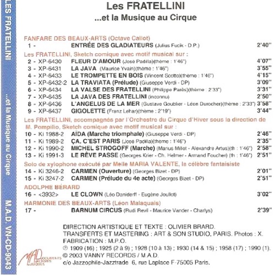 (1) Harmonie des Beaux-arts (Léon Malaquais) - 1958 - Extrait du Pathé ST1098 (Faites dansez les Rosières) (2) Fanfare des Beaux-Arts (Octave Callot) - 1990 - Extrait du CD FOC02 (Opium) (3) Les Fratellini, sketch comique avec motif musical (4) Les Fratellini et l’Orchestre du Cirque d’Hiver (5) Maria Valente (xylophone) (6) Adolphe Bérard |