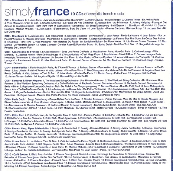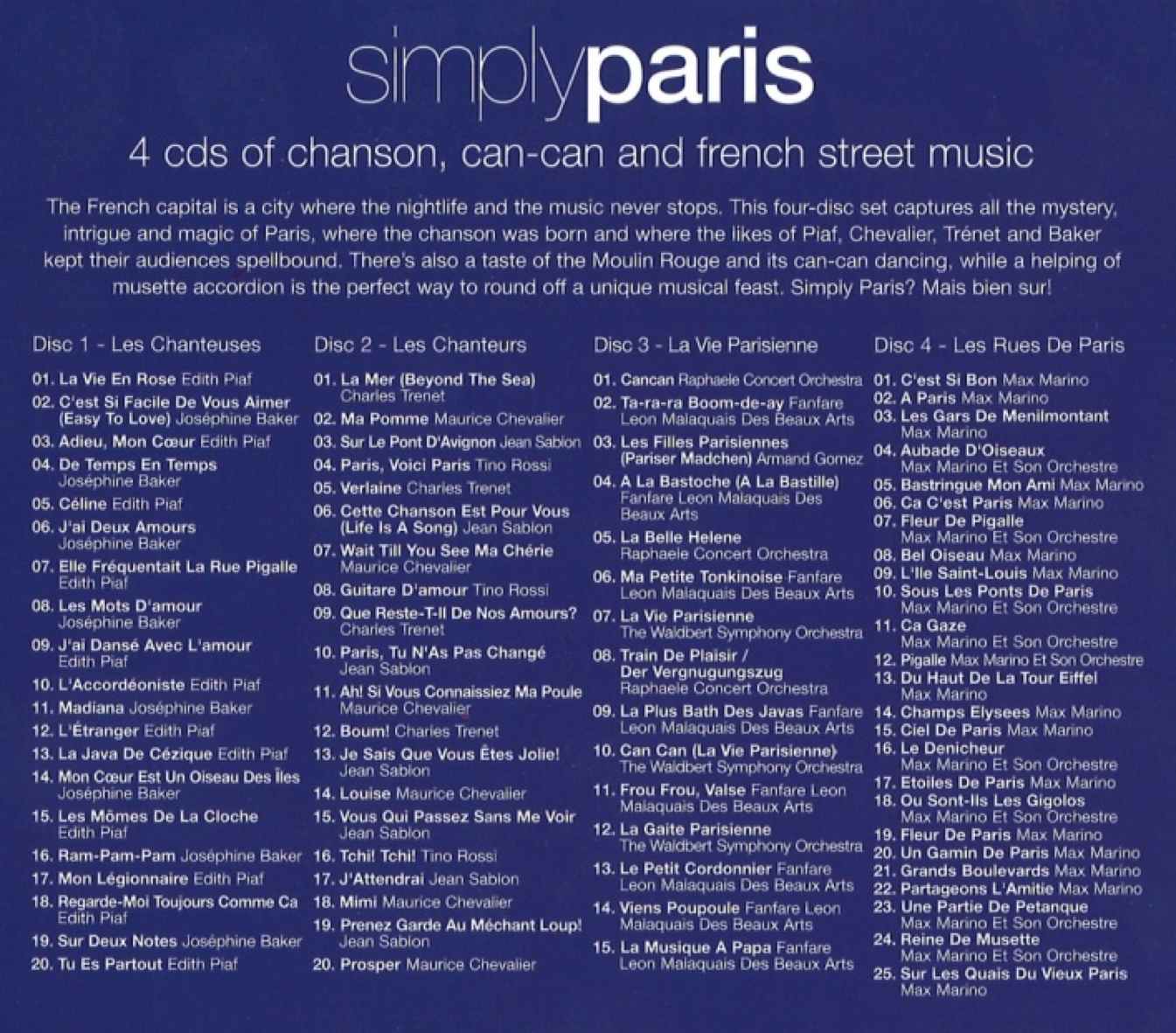 Les deux premiers CD, nommés "Chanteurs 1" et "Chanteurs 2", présentent un panel de chanteurs et chanteuses françaises des années 1920 à 50, le CD 3 étant consacré à l'accordéon. Retour à la chanson française avec le CD 4 "Salon Facile "(sic) et le CD 6 "Paris Cool", ce dernier avec des chansons consacrées à Paris.