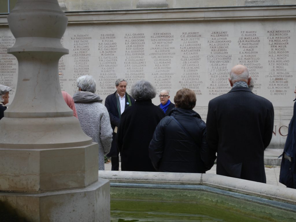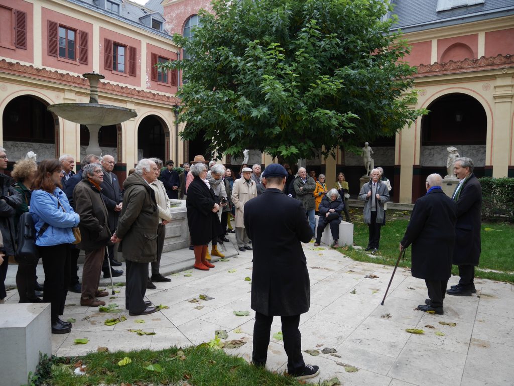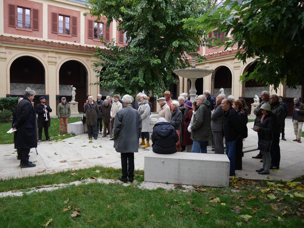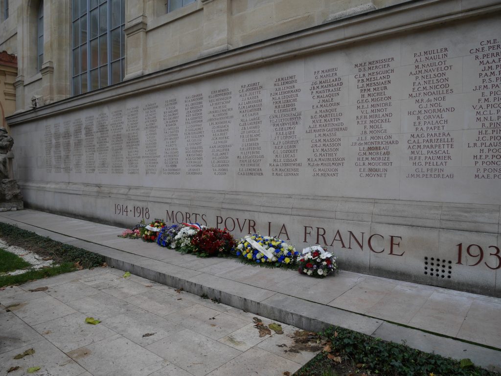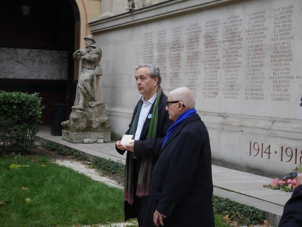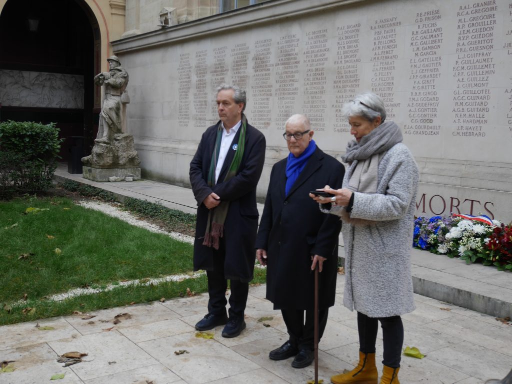 Le mardi 11 novembre 2025 à 11H00 a eu lieu dans la Cour du Mûrier de l’École Nationale Supérieure des Beaux-Arts de Paris la traditionnelle cérémonie pour commémorer et rendre hommage aux 467 étudiants, professeurs et personnels de l’École des Beaux-Arts qui sont tombés aux champs d’honneur lors de la guerre de 1914-1918 mais aussi à tous ceux des guerres de 1870-1871, de 1939-1945 et de décolonisation dont le sacrifice a fait que l’École des Beaux-Arts s’est vue conférer, d’abord la Croix de Guerre (1926), puis celle de la Légion d’Honneur (1934).