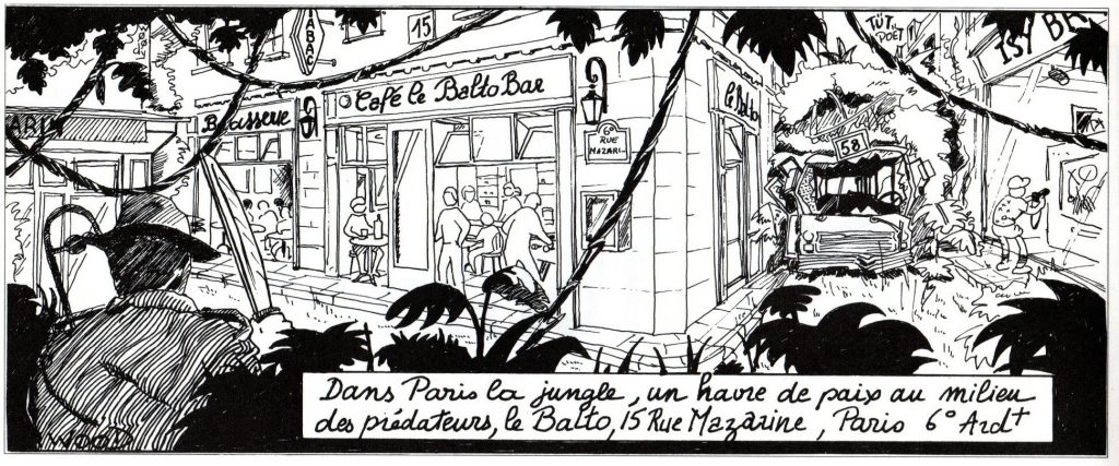 Le Balto avec Sabine et Charly en caricature devant l'entrée. / Dessin de 1985 de Pierre-Xavier "Aldo" Grézaud.