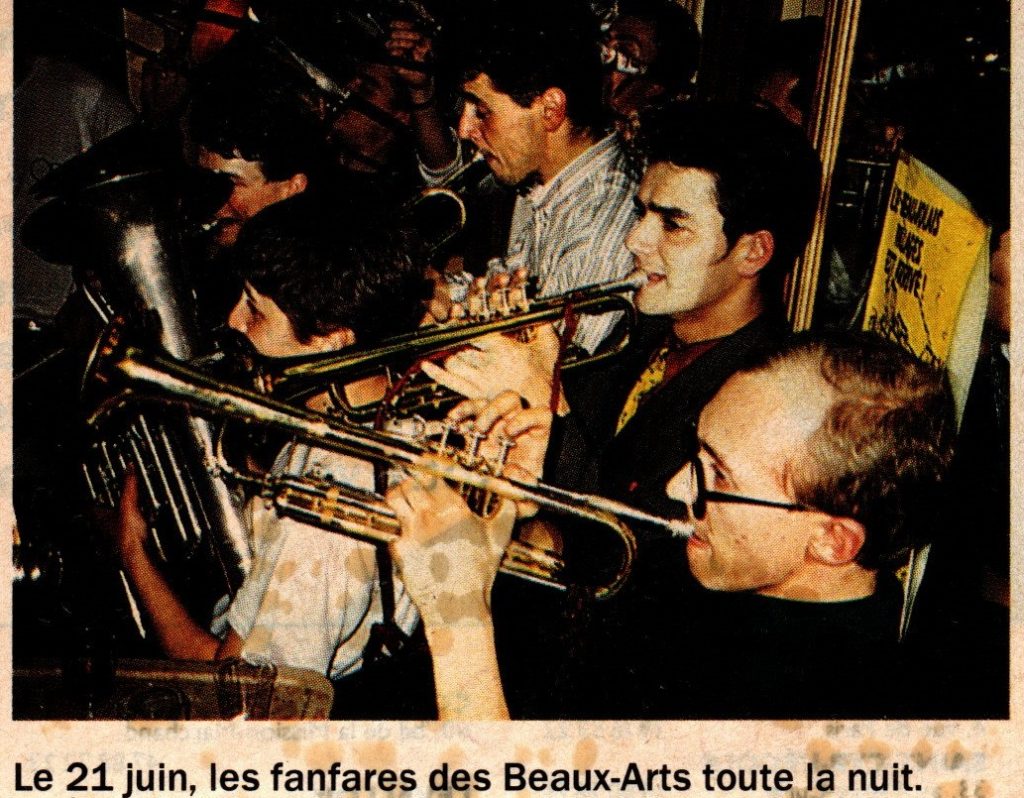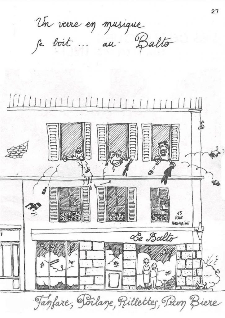 “Le Balto” fait également partie d’un des rares estaminets du quartier à accueillir les fanfares des Beaux-Arts. Nombreuses sont les fanfares y ayant fait leurs débuts : Les Boula Matari (en 1985), les Irkâme (en 1984), les Friedrich Mistral (en 1985), les Kosmonot (en 1987), les Charlot d’Éon (en 1987), les Chili (en 1990), et bien d’autres…. N’oublions pas les “vieux” de la Fanfare Archibal Buci (1968 encore presque en activité aujourd’hui !), celle des Archiduquai (1977 – 1985) et de celle des 7 Mercenaires (1983 – 1990) qui y ont aussi largement traîné leurs guêtres.