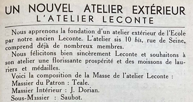 André LECONTE fondera en décembre 1932, suite à cela, un atelier extérieur situé au 10 bis, rue de Seine à PARIS (6ème) qui déménagera en mai 1934 au 21, rue Hautefeuille à PARIS (6ème). La composition de la toute première Masse de l’atelier LECONTE est la suivante : Massier du Patron : André TEALE (1903 – 1989, admission en 1925, diplômé en 1941) / Massier Intérieur : Jean DORIAN (1906 – 1998, admission en 1928, diplômé en 1934) / Sous-Massier : Jean SAUBOT (1906 – 2002, admission en 1932, diplômé en 1940).